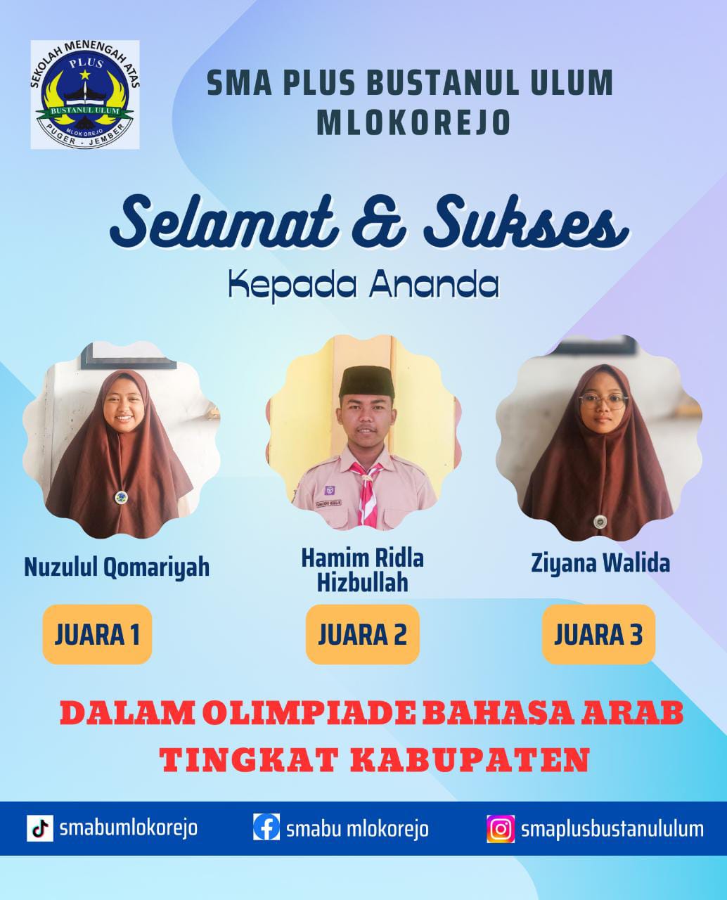 Pada tanggal 19 Agustus 2023 merupakan hari yang ditunggu-tunggu oleh peserta olimpiade tidak terkecuali guru pembimbing dan kepala sekolah untuk mendengar informasi ini. Dan dengan izin Allah Swt. serta upaya dan usaha lahir batin SMA Plus Bustanul Ulum Mlokorejo kini meraih dan memborong kejuaraan tingkat kabupaten yaitu Juara 1 (Nuzul Qomariyah kelas XI 4), Juara 2 (Hamim Ridho Hizbullah kelas XII MIPA 1), dan Juara 3 (Ziyana Walida XII IPS 2) berdasarakan Surat Keputusan Ketua Forum MGMP Bahasa Arab se-Indonesia nomor 79/OBA-6/F-MGMP-BA/VIII/2023.