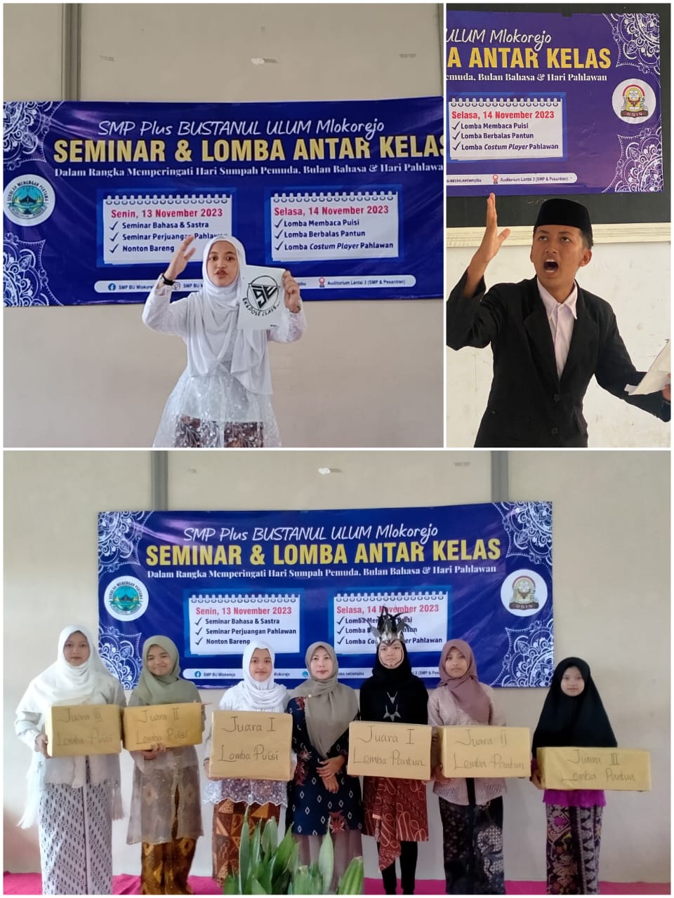 MediaSMPBU-Mlokorejo, Selasa (14/11), Sekolah Menengah Pertama (SMP) Plus Bustanul Ulum sukses menyelenggarakan "Lomba Membaca Puisi & Berbalas Pantun Antarkelas dan Costume Player", dalam rangka memperingati Hari Sumpah Pemuda, Bulan Bahasa, dan Hari Pahlawan. Acara ini dilaksanan di dua tempat yang berbeda. Aula SMP digunakan sebagai tempat perlombaan bagi para siswa, sedangkan para siswi melangsungkan lomba di Aula Pondok.