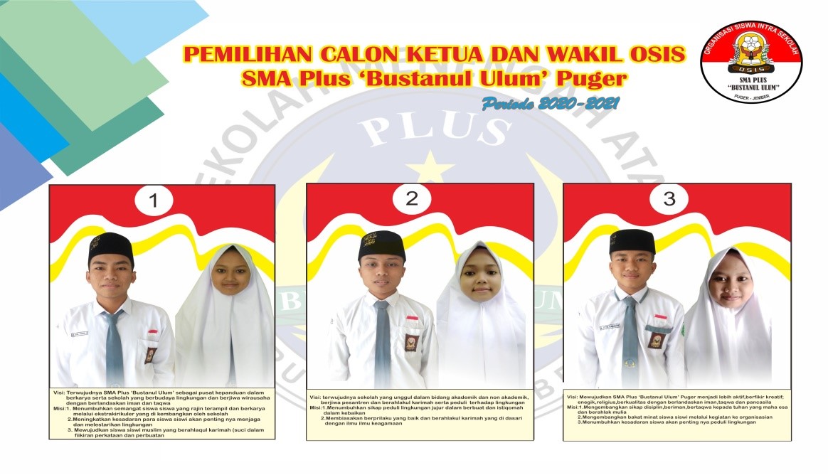 Pada bulan November tahun 2020, warga SMA Plus âBustanul Ulumâ Puger melaksanakan pesta demokrasi âPemilihan Ketua dan Wakil Pengurus OSIS Masa Bakti 2020/2021â. Sebelum pemilihan, kandidat melakukan kampanye ke masing-masing kelas dengan menyampaikan visi dan misinya masing-masing. Kampanye dilaksanakan untuk memberikan pertimbangan pada pemilih dalam menentukan pilihannya. Terdapat tiga kandidat Ketua dan Wakil yaitu: