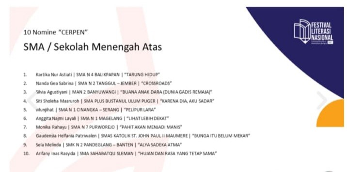 Cerpen berjudul Karena Dia, Aku Sadar karya: Siti Sholeha Masruroh di bawah asuhan ibu Nonik Purwati, M. Pd, masuk sebagai nominasi 10 karya cerpen terbaik dalam Festival Literasi Nasional (FLN) yang digelar pada bulan Maret ini. Semoga melalui program literasi, dapat mewujudkan generasi muslim SMA Plus Bustanul Ulum Puger yang cerdas berkualitas. Amin.