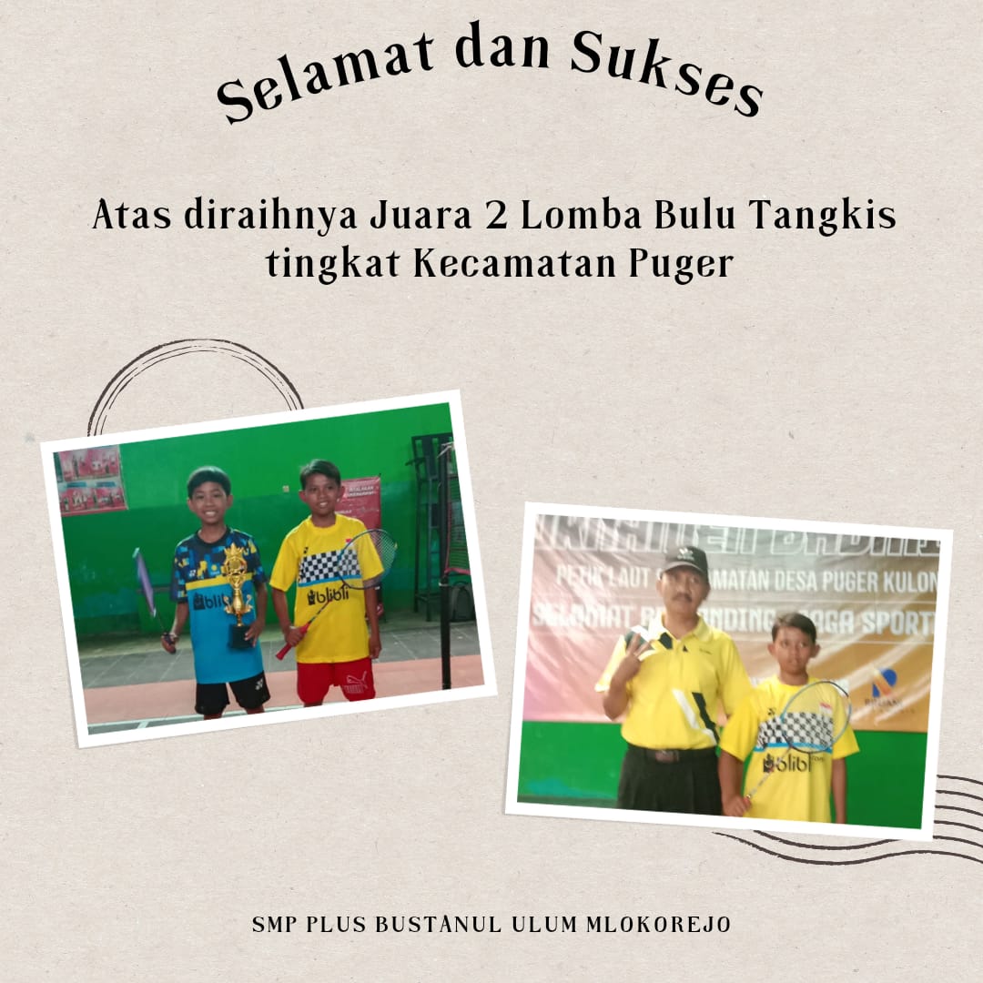 Siswa SMP Plus Bustanul Ulum Mlokorejo berhasil meraih prestasi juara 2 dalam ajang lomba bulu tangkis yang diselenggarakan di Kecamatan Puger dalam rangka memperingati Hari Ulang Tahun Ke-78 Republik Indonesia (HUT Ke-178 RI). Prestasi diukir Dava Sidqi Setiawan, siswa kelas IX A yang berhasil meraih juara 2 cabang lomba bulu tangkis se-Kecamatan Puger pada 10 Agustus 2023 di Gedung H. Opik. Dengan semangat dan kegigihannya, Dava berhasil menyisihkan peserta bulu tangkis lain dari sekolah swasta dan negeri tingkat SMP se-Kecamatan Puger.